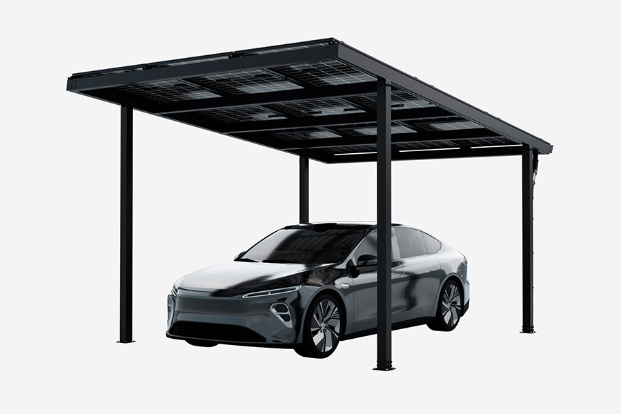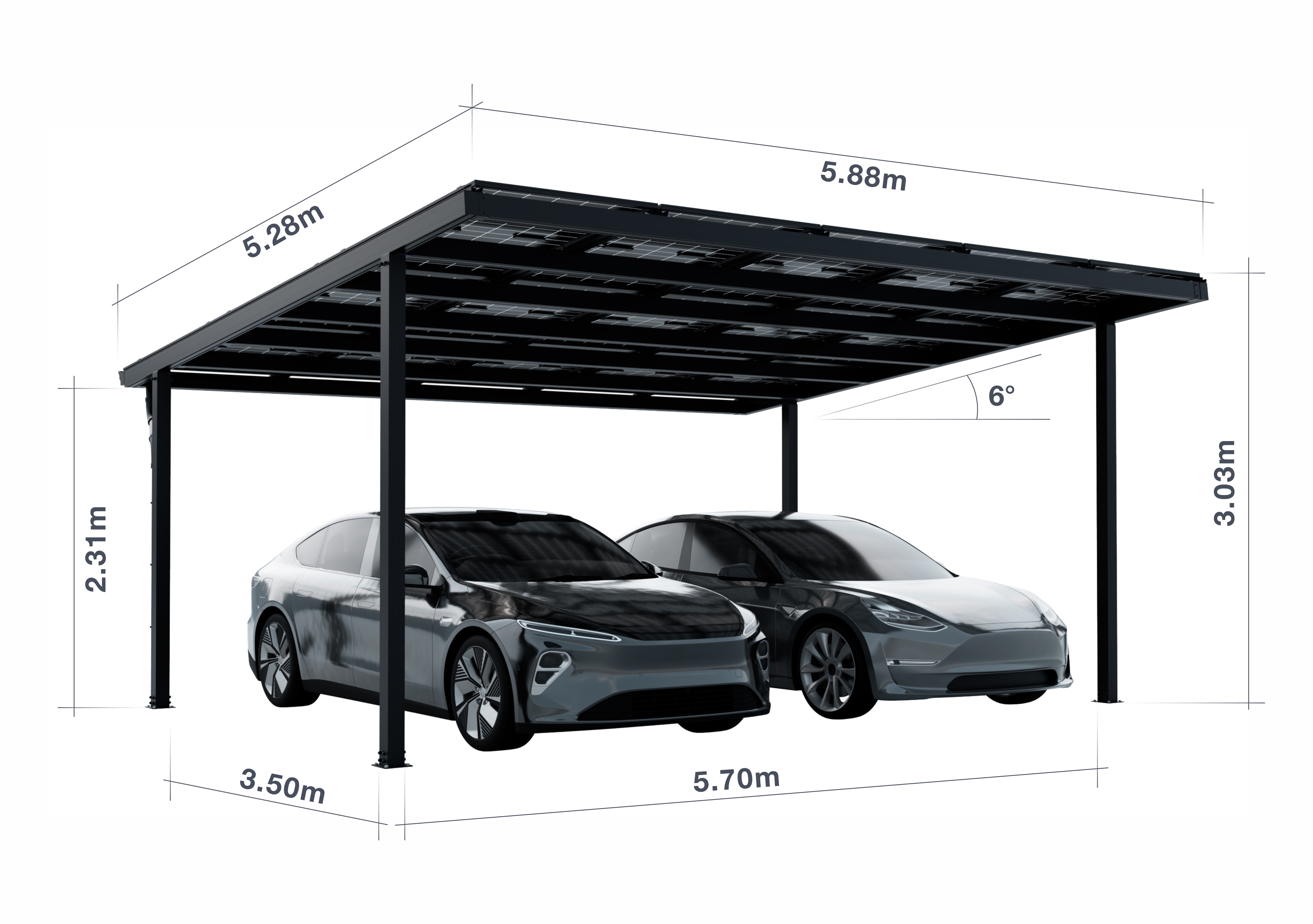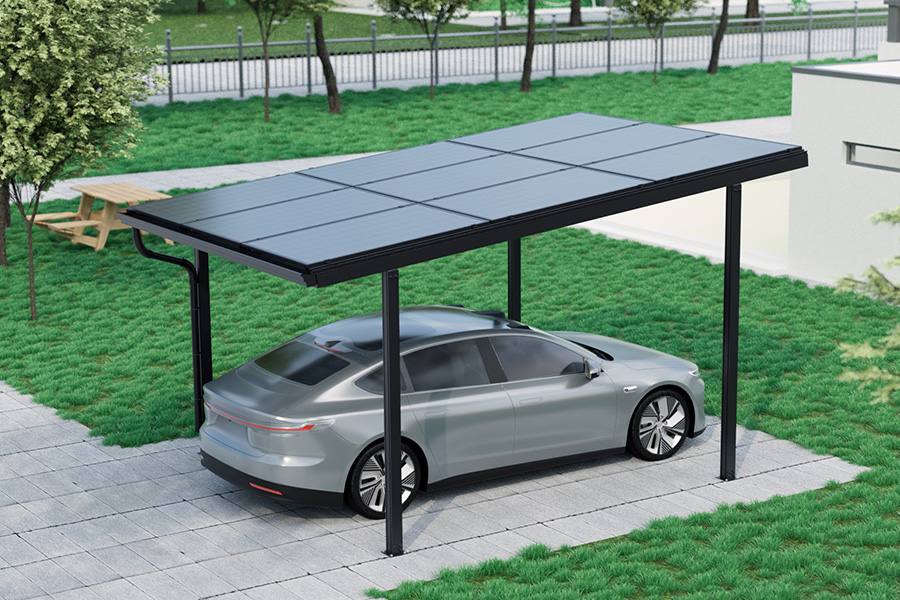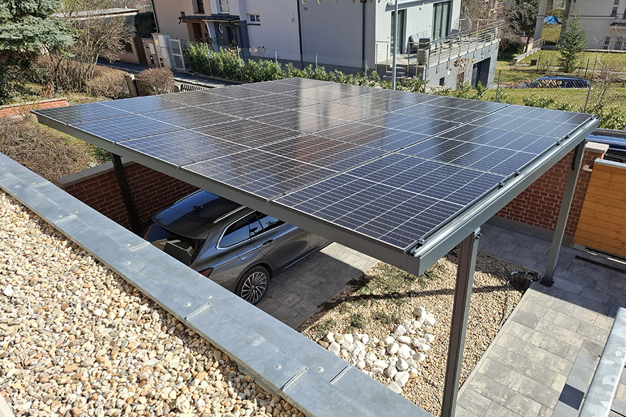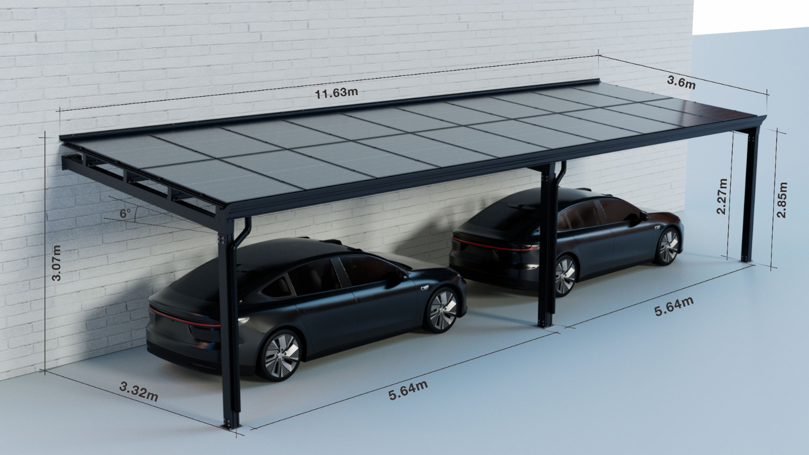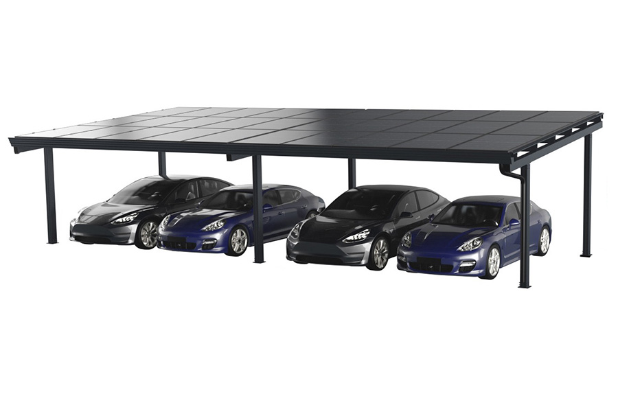 ● Hliníková rámová konstrukce se skládá ze čtyř otevřených stran a jedné mírně šikmé střechy tvořené solárními panely
