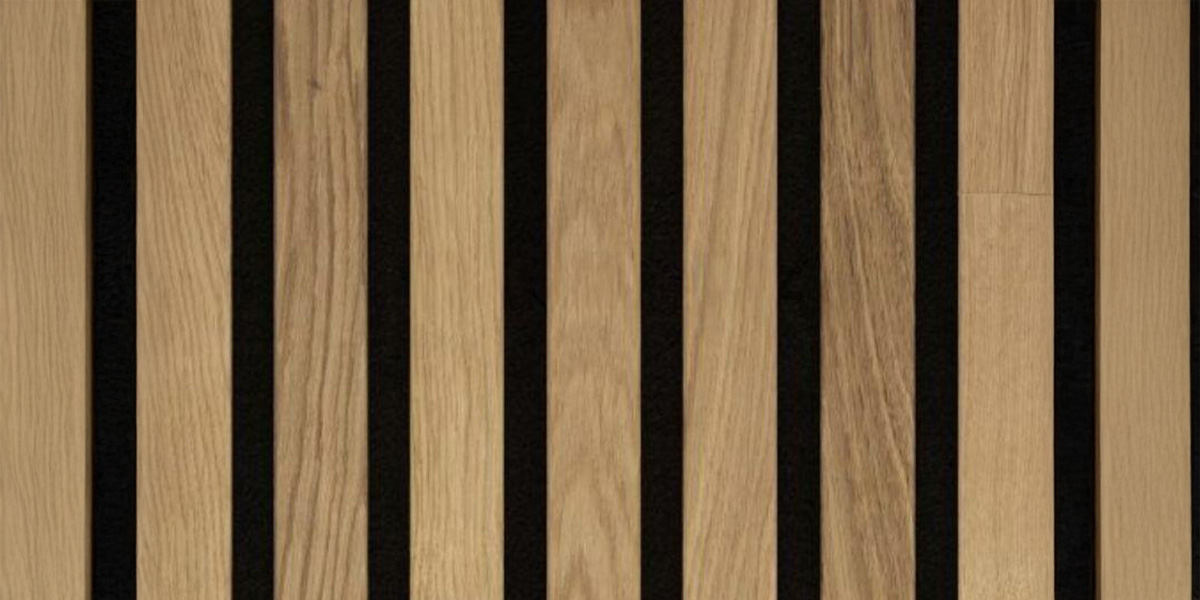Atraktivní obkladové panely z masivního matně lakovaného dřeva a vysoce kvalitního veganského filcu výrazně zlepšujícího akustiku v místnosti.