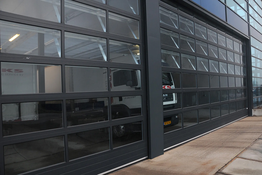 ● Konstrukce z hliníkových profilů umožňuje osazení skleněnými výplněmi, nebo jejich kombinaci s plnými panely. Vrata tak propouštějí maximum denního světla a působí moderním architektonickým dojmem.