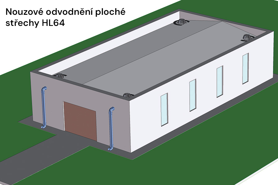 ● nouzové střešními vtoky napojenými na potrubí s částečným plněním, vyústěné nad terén vně budovy, nebo