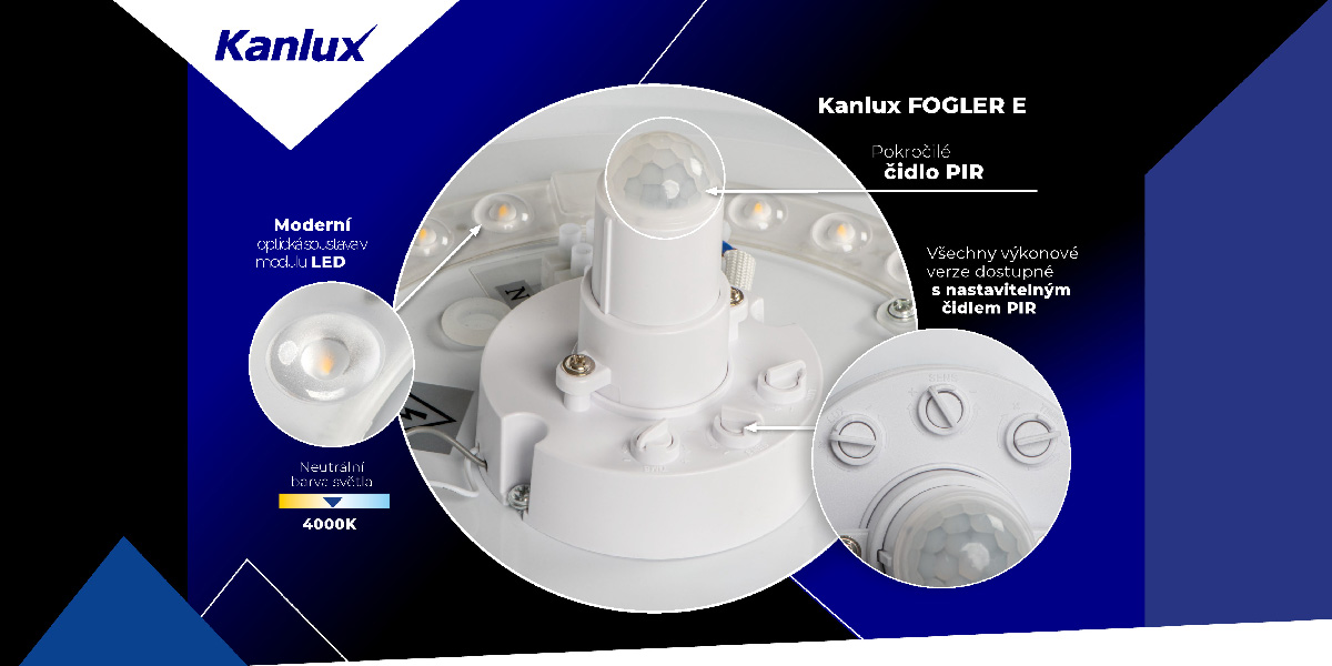 Stropní LED svítidla Kanlux FOGLER E představují praktické a spolehlivé řešení osvětlení chodeb, schodišť, skladů, technických místností a dalších užitkových prostor. Jsou vybavena vestavěným PIR čidlem, které reaguje na teplo pohybujícího se objektu. Díky tomuto principu pracuje selektivněji než mikrovlnné senzory a pomáhá snižovat riziko falešného sepnutí světla.