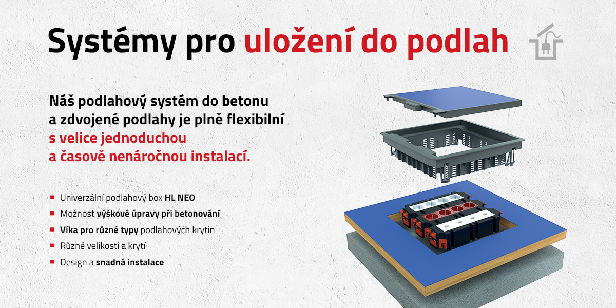 Podlahový systém HL NEO představuje flexibilní řešení pro instalaci do betonu i zdvojených podlah. Díky univerzálnímu podlahovému boxu a široké nabídce vík různého tvaru a velikosti je systém vhodný pro různé typy podlahových krytin – od koberce až po beton. Instalace je rychlá, přesná a nenáročná. Výšku betonové mazaniny lze jednoduše přizpůsobit pomocí instalačních elementů, které se po zatuhnutí odříznou. Víka umožňují krytí až IP53 a v kombinaci s moderním designem splňují požadavky současných uživatelů.