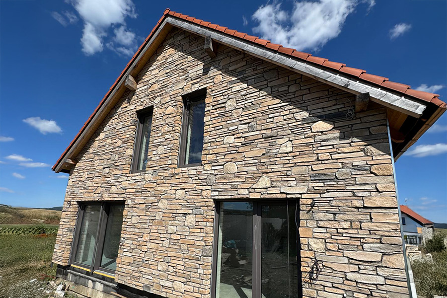 Castelo je kamenný obkladový aglomerát ve tvaru štípaných skalních úlomků....
