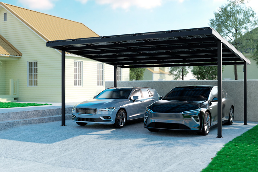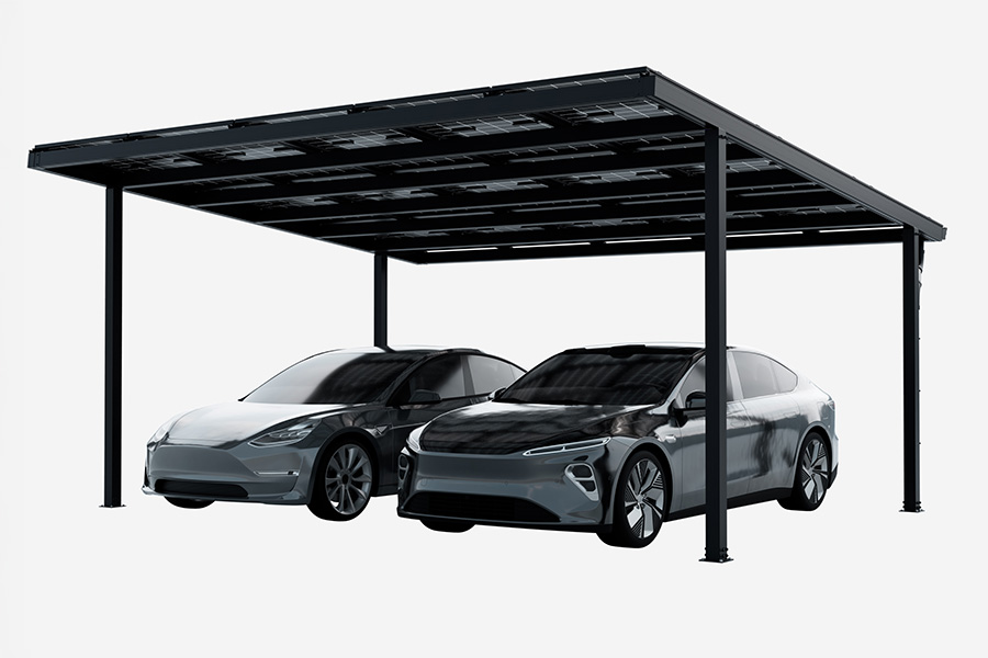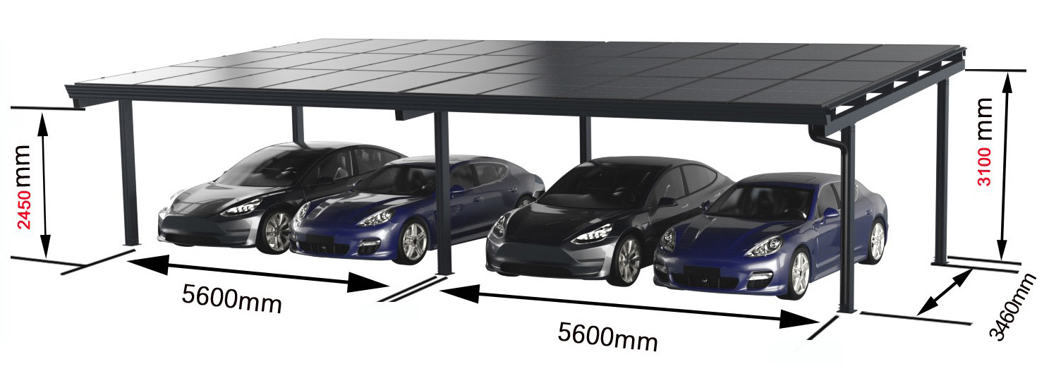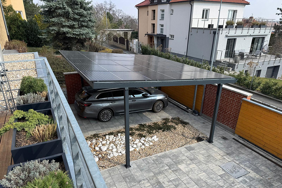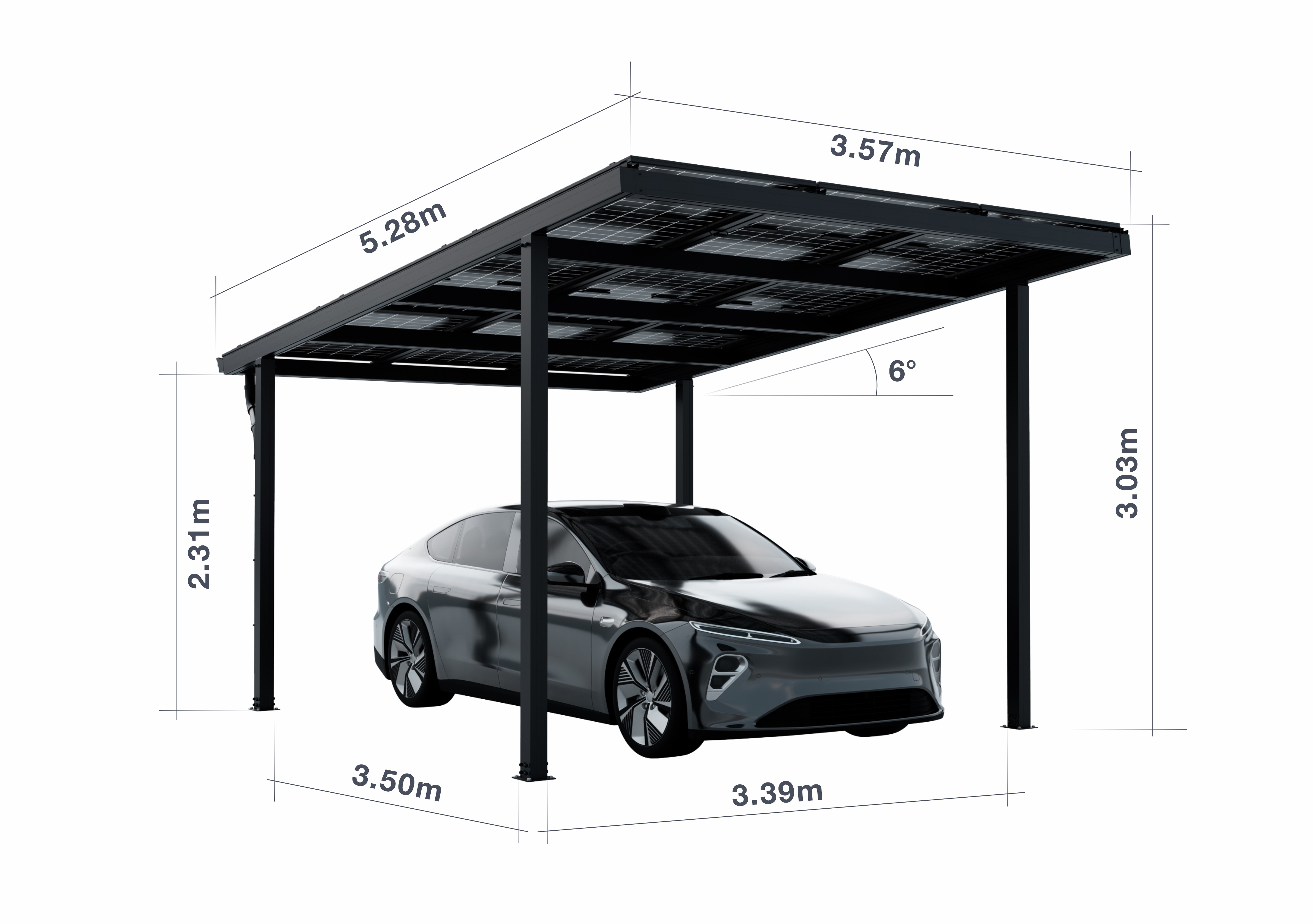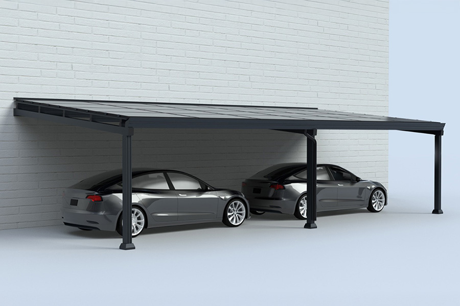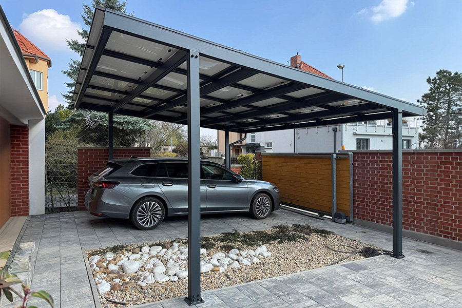 ● Hliníková rámová konstrukce se skládá ze čtyř otevřených stran a jedné mírně šikmé střechy tvořené solárními panely