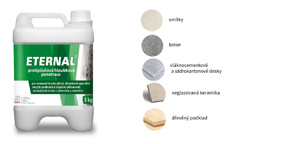 ETERNAL protiplísňová hloubková penetrace je speciální vodou ředitelný nano penetrační prostředek určený k prevenci vzniku plísní na různých savých podkladech, jako jsou omítky, beton, sádrokarton, vláknocementové desky či zdivo. Lze jej použít i na dřevěné podklady a neglazovanou keramiku. Díky svému složení proniká hluboko do materiálu, kde zpevňuje povrch, zvyšuje přilnavost následných vrstev zejména nátěrů, tmelů, lepidel, omítkovin a stěrkových hmot, a dlouhodobě brání růstu mikroorganismů. Při správné aplikaci zachovává přirozený průchod vodních par zdivem.
