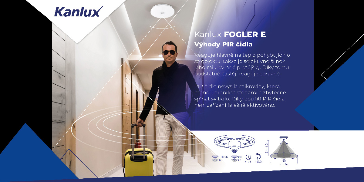 Stropní LED svítidla Kanlux FOGLER E představují praktické a spolehlivé řešení osvětlení chodeb, schodišť, skladů, technických místností a dalších užitkových prostor. Jsou vybavena vestavěným PIR čidlem, které reaguje na teplo pohybujícího se objektu. Díky tomuto principu pracuje selektivněji než mikrovlnné senzory a pomáhá snižovat riziko falešného sepnutí světla.